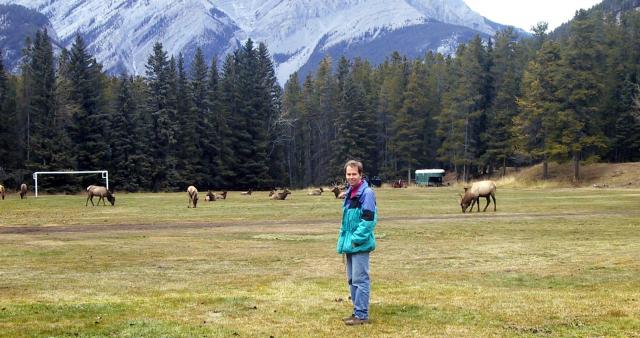 Elk can be found roaming all over the town of Banff. The senior male of the heard can be seen laying down, just past Randy's right shoulder.