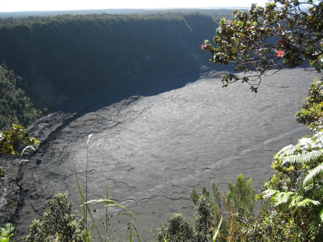 Looking down to the Kilauea Iki crater floor. The light gray streak across the floor is the return "path".