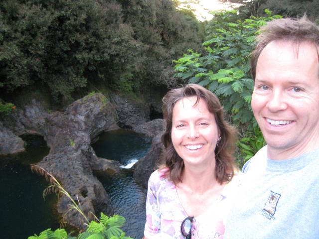 Just a five minute walk up a quiet residential street from our B&B (www.thebigislandvacation.com) is section of the Wailuku River called Boiling Pots. Apparently when there's more water flowing, these bowls in the background are "boiling". This was our 7th attempt at a self portrait, so we were unnaturally giddy for this early hour.